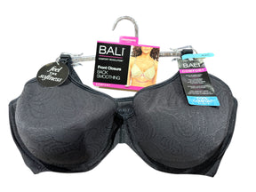 This Bali underwire bra in black, size 42C, features a front closure design for convenient fastening and easy adjustment. The lined underwire construction provides structured support and a smooth silhouette under clothing. Engineered for comfort and durability, this classic style delivers reliable lift and shaping throughout the day.