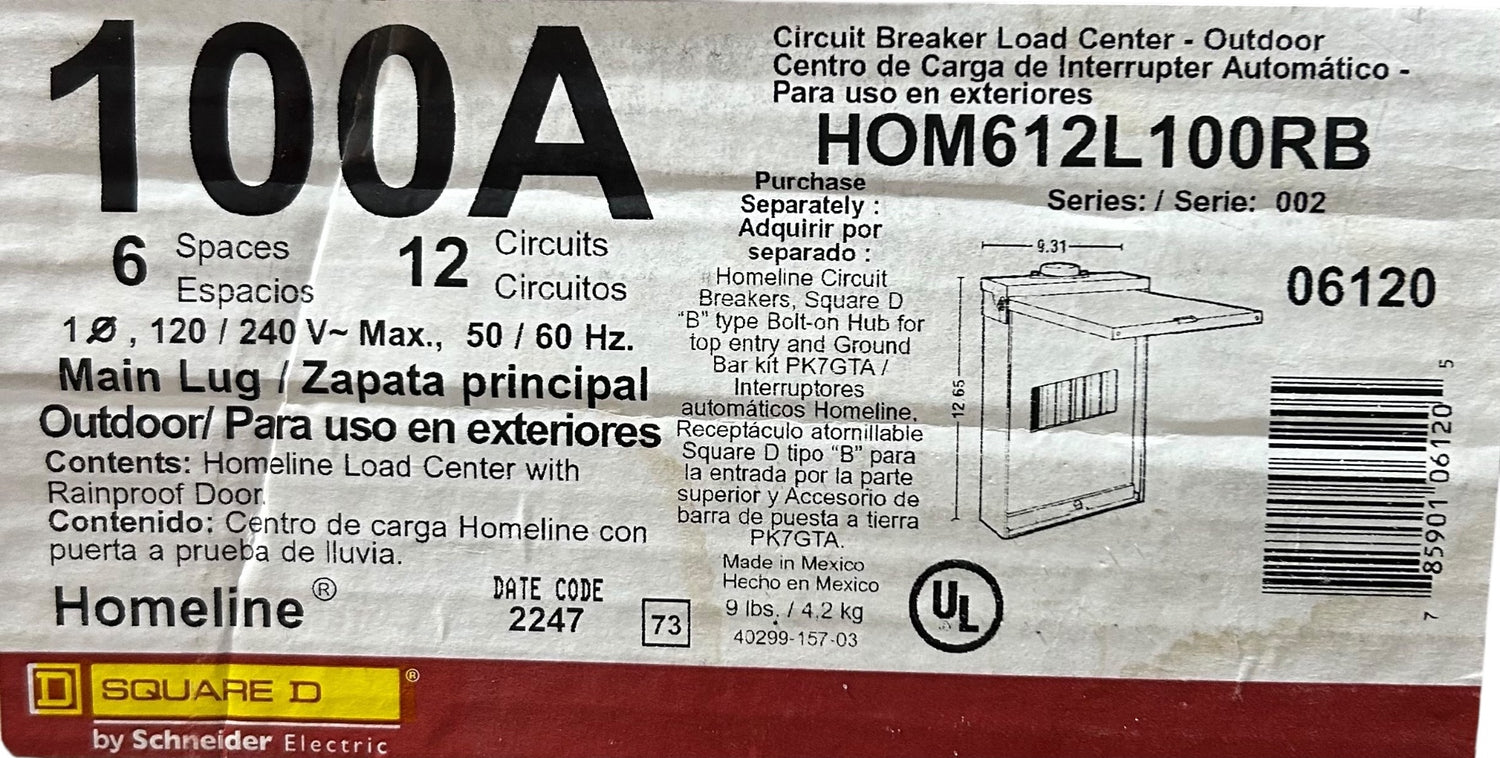 The Schneider Electric HOM612L100RB is a compact 100 Amp, 6‑space / 12‑circuit outdoor load center from the Homeline series, designed for reliable residential power distribution. This main‑lug‑only panel features a durable NEMA 3R rainproof enclosure, tin‑plated aluminum bus bars, and distributed neutral bars for clean, efficient wiring.