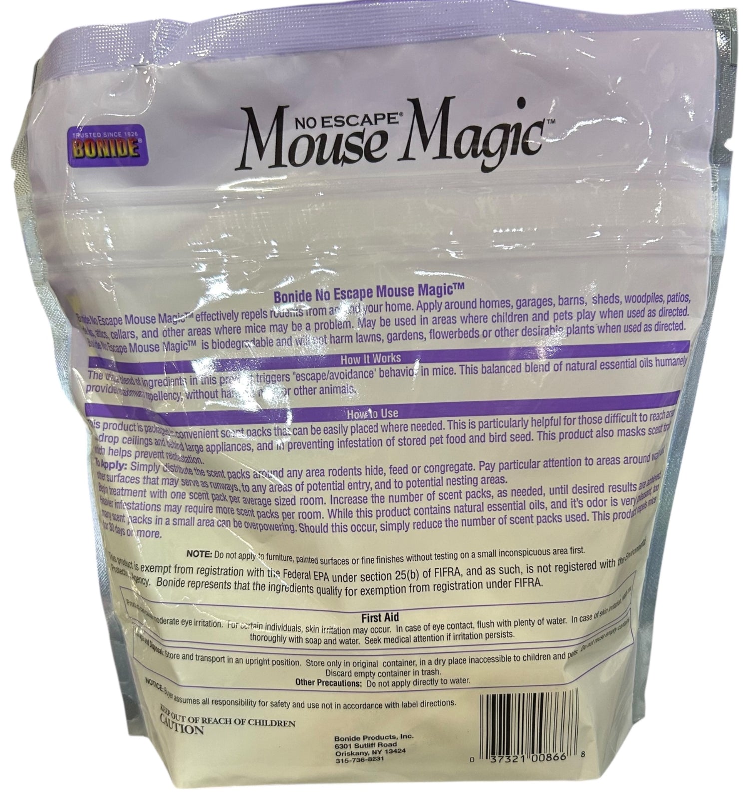 Bonide No Escape Mouse Magic delivers professional-grade rodent deterrence through strategically formulated scent technology. This 12-pack of repellent sachets uses potent aromatic compounds that create an inhospitable environment for mice and rats, encouraging them to seek shelter elsewhere. Each pack provides extended coverage, making it ideal for protecting storage areas, attics, basements, garages, and crawl spaces where rodent activity poses a threat. The scent-based approach offers a non-toxic alternative to traps and poisons, eliminating concerns about chemical residue or accidental exposure to pets and children. Simply place sachets in problem areas or along suspected entry points to establish a protective perimeter. The concentrated formula works continuously, providing reliable defense against unwanted rodent intrusions throughout your property. Perfect for both preventative maintenance and active infestation management.